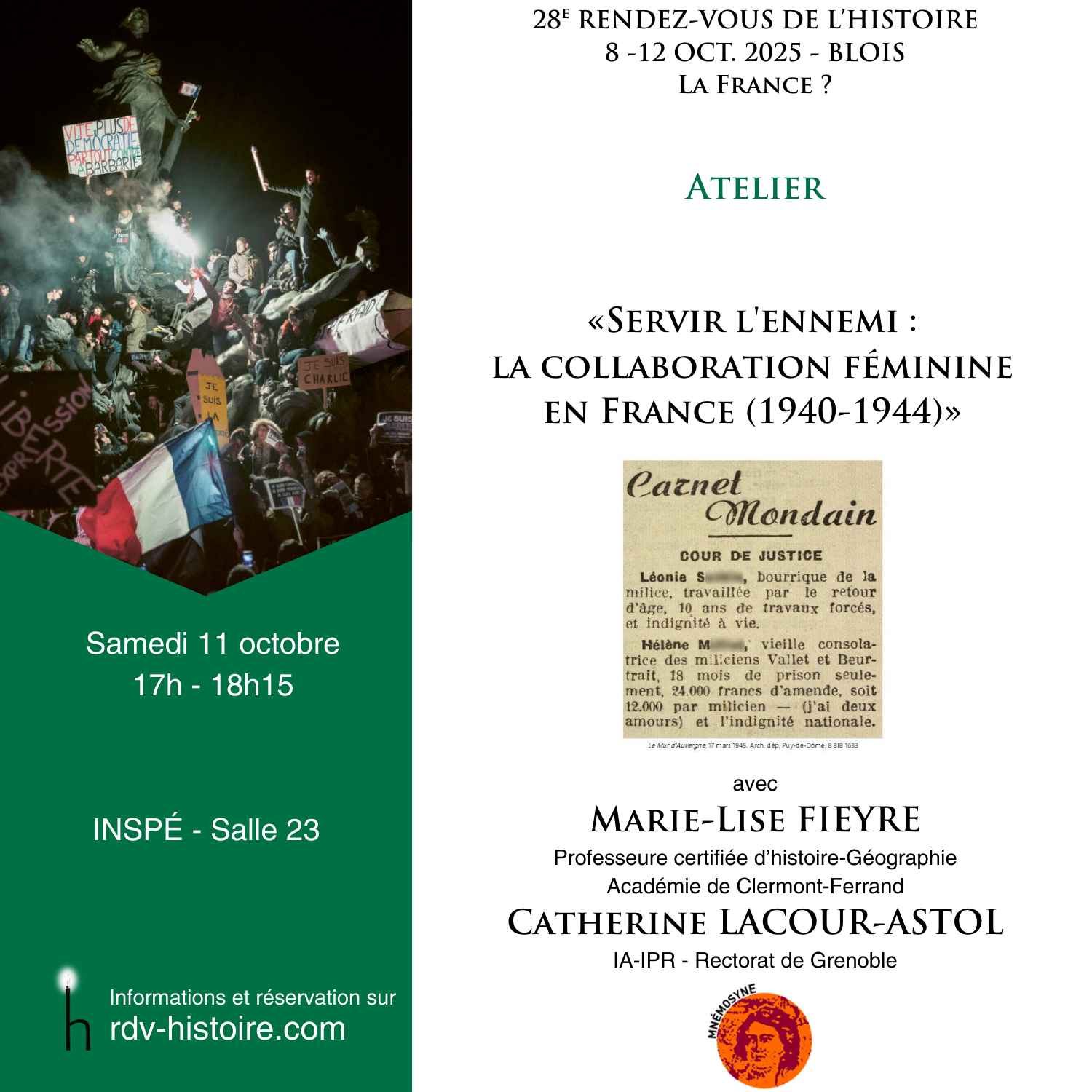 Servir l’ennemi : la collaboration féminine en France (1940-1944) – Atelier pédagogique de l’association, le samedi 11 octobre, de 17h00 à 18h15